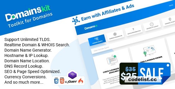 DomainsKit Script is a powerful PHP-based script that consists of many great Domain & IP Tools it allows you to search domain names instantly. It has a built-in whois domain tool, domain generator tool, hostname & IP lookup tool, and domain DNS records tool. It is built with a fully responsive design based on Latest Bootstrap to ensure that your website will look flawless and beautiful on every mobile and desktop device. It also has strong cross-browser support.