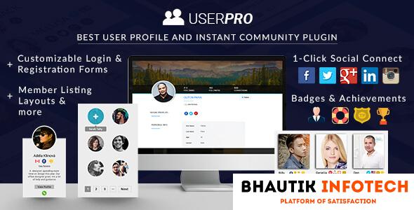 UserPro offers beautiful front-end user profiles, member directory, login and registration for WordPress. Create a WordPress Community website with UserPro’s awesome features like social connect and integration(1 click auto signup / signin, viral marketing, user badges, file upload, photo uploads with lightbox support, responsive videos, follow / unfollow users, verified accounts, content restriction (private content), frontend publisher, posts by user, public / private Activity Feed.